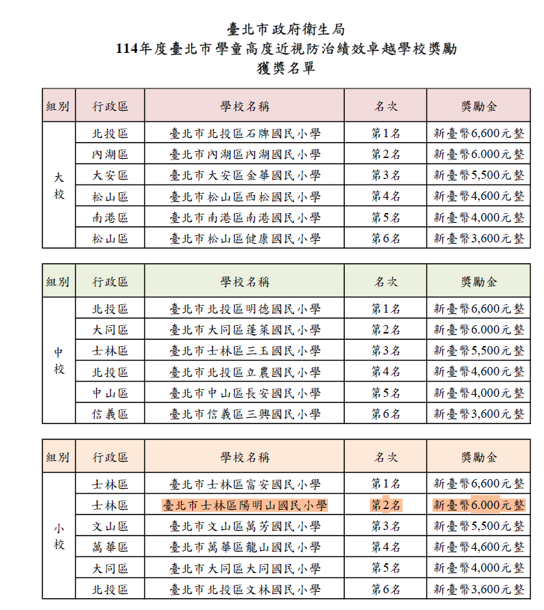 恭賀本校榮獲「114年度臺北市學童高度近視防治績效卓越學校獎勵方案」-小校組第2名