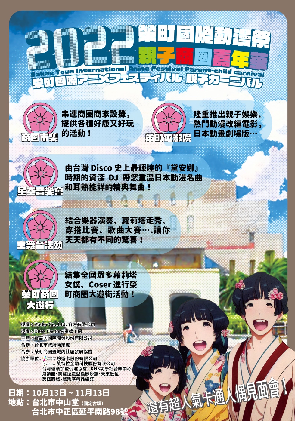 一、旨揭活動資訊如下: (一)活動地點:臺北中山堂廣場。 (二)活動內容:電影播放、動漫表演、穿搭大賽、舞台表演 等活動。 (三)活動時間:111年10月13日(星期四)至11月13日(星期 日)。平日下午2時至晚上9時;假日上午10時至晚上9 時。 (四)優惠活動:國小12歲以下學童攜帶悠遊卡參與展覽享有 展場優惠。