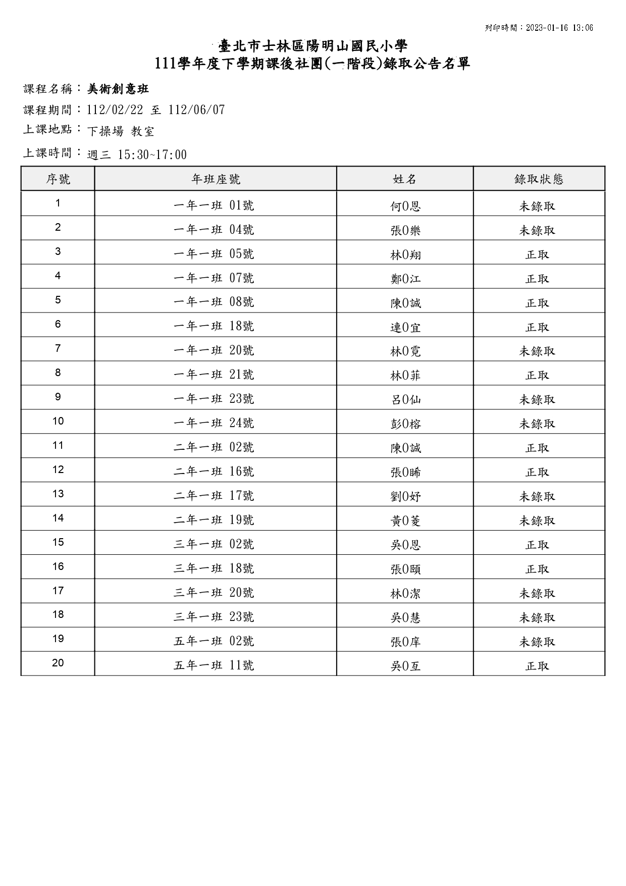 1.本次需抽籤社團共1組:美創社(週三),抽籤結果附件。