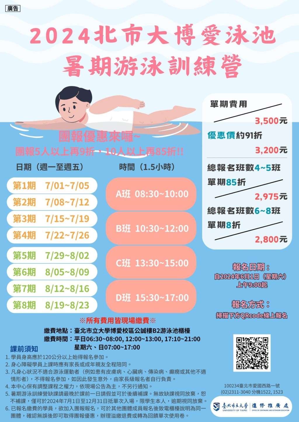 二、本校博愛校區泳池環境優良、設備完善、師資專業,請惠 予轉知校內同學及家長,歡迎前來報名參加泳訓班。線上 報名頁面連結:https://cee.utaipei.edu.tw/course /164 。