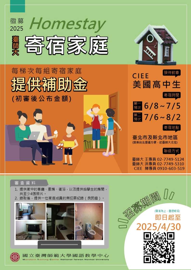 為促進美國高中生於臺學習期間與當地臺灣人進行 文化交流、培養日常生活中運用華語的能力,故特別招募 台灣寄宿家庭,提供高中生四週上課期間的寄宿接待。本 次辦理招募相關說明會,並分享接待家庭之相關經驗,敬 邀各校校長、主任、師長、國際教育承辦人及有興趣之家 長參加。