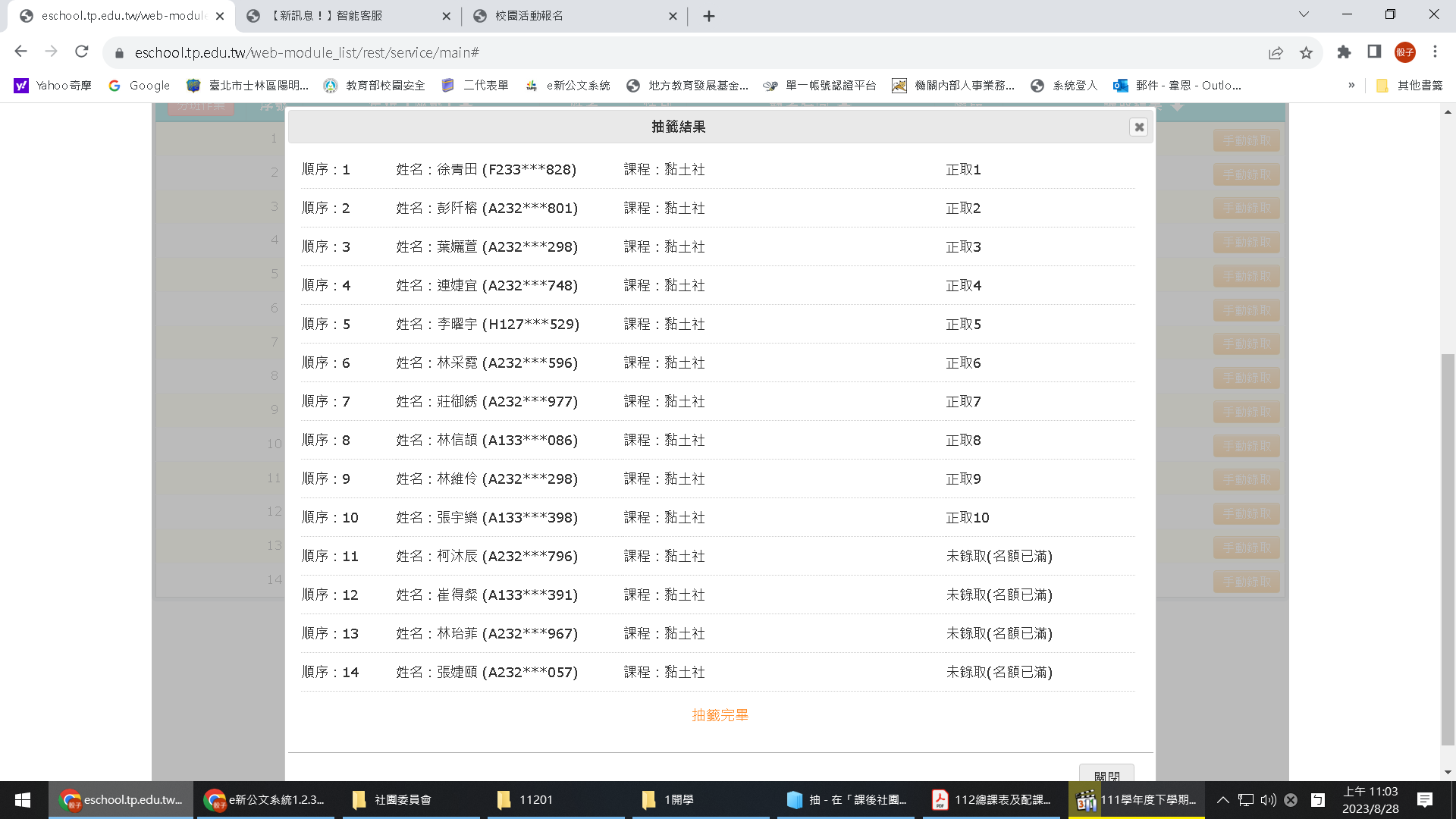 已會同家長社團委員抽籤,記錄影片留存於學輔處,結果如下: