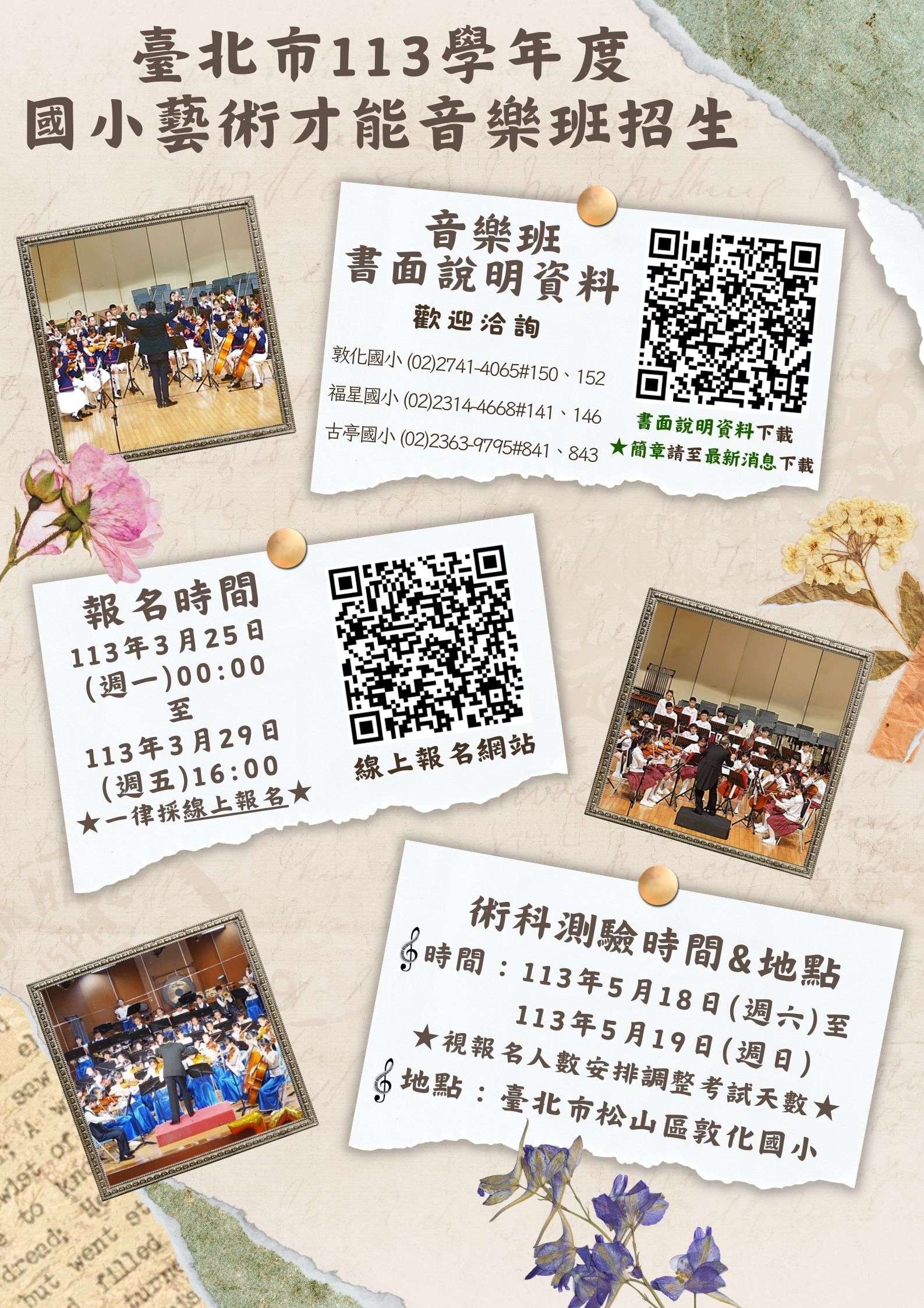 二、報名時間及方式:113年3月25日(星期一)00:00起至3月 29日(星期五)16:00止,於本市國中小藝才班鑑定報名 系統(https://tparttalent.tp.edu.tw)報名。