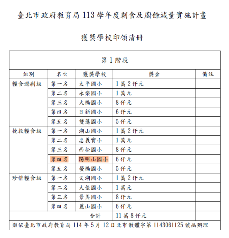 恭喜本校榮獲臺北市政府教育局113學年度剩食及廚餘減量實施計畫-挽救糧食組第4名。